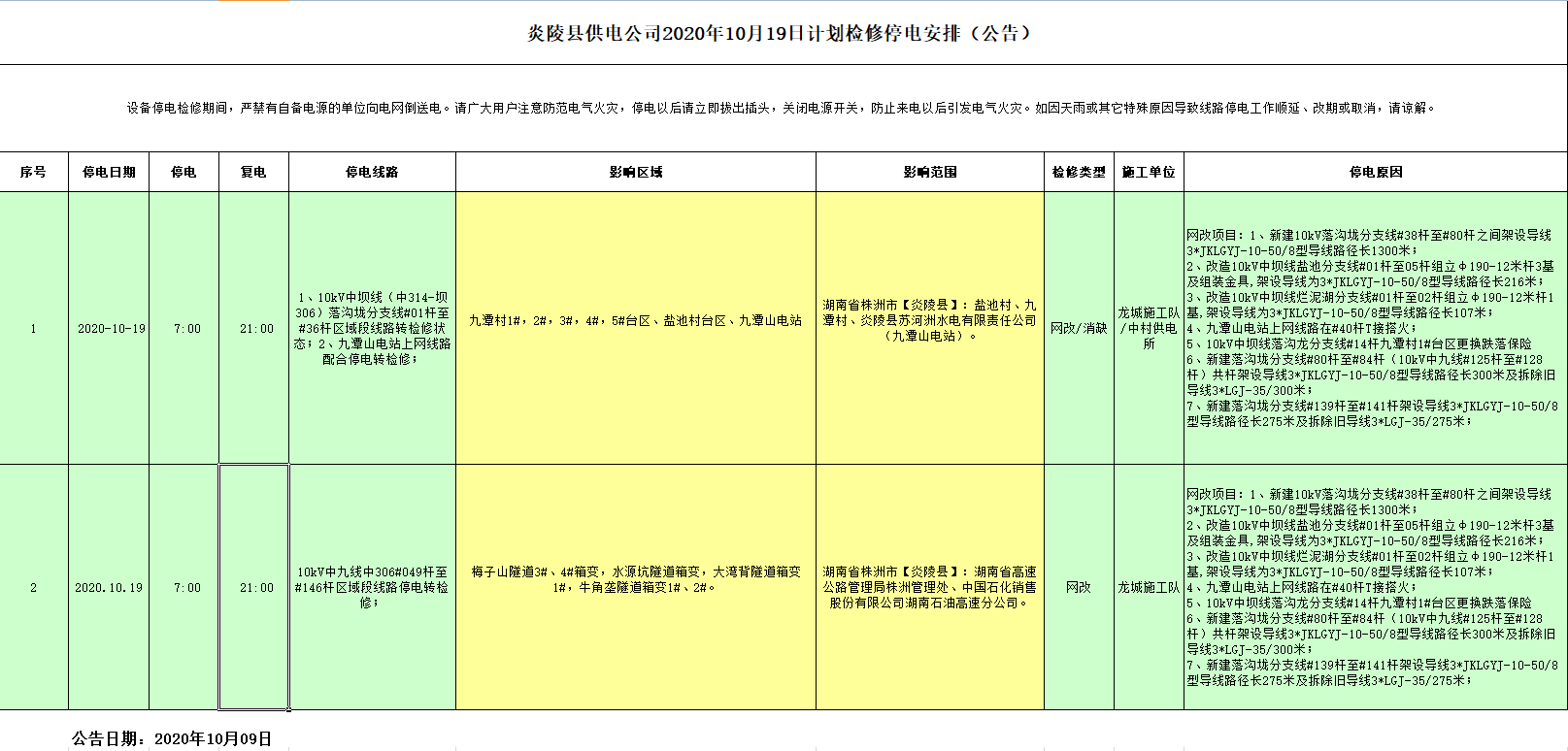 炎陵县供电公司2020年10月19日计划检修停电安排