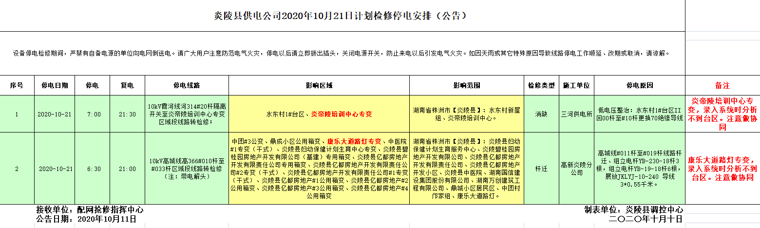 炎陵县供电公司2020年10月21日计划检修停电安排