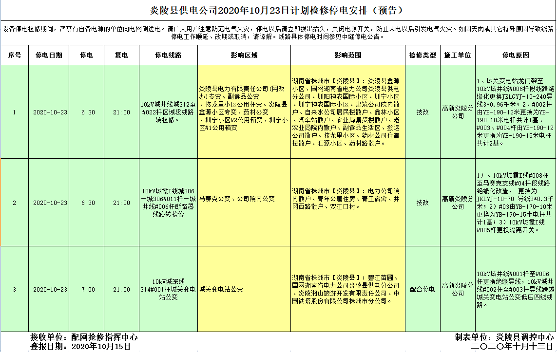 炎陵县供电公司2020年10月23日计划检修停电安排
