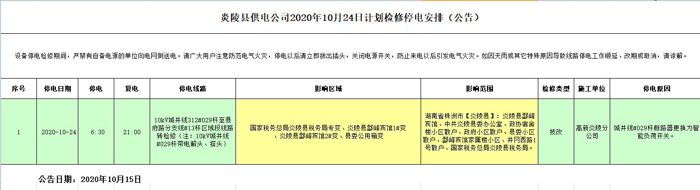 炎陵县供电公司2020年10月24日计划检修停电安排