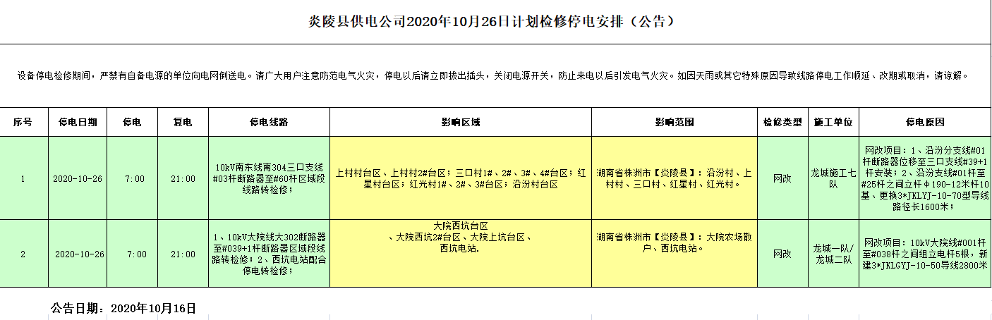炎陵县供电公司2020年10月26日计划检修停电安排