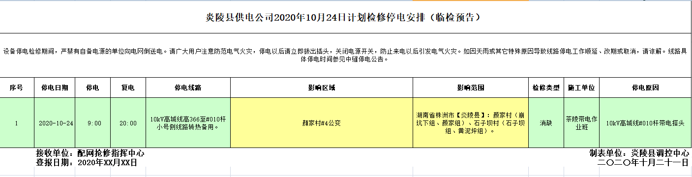 炎陵县供电公司2020年10月24日计划检修停电安排
