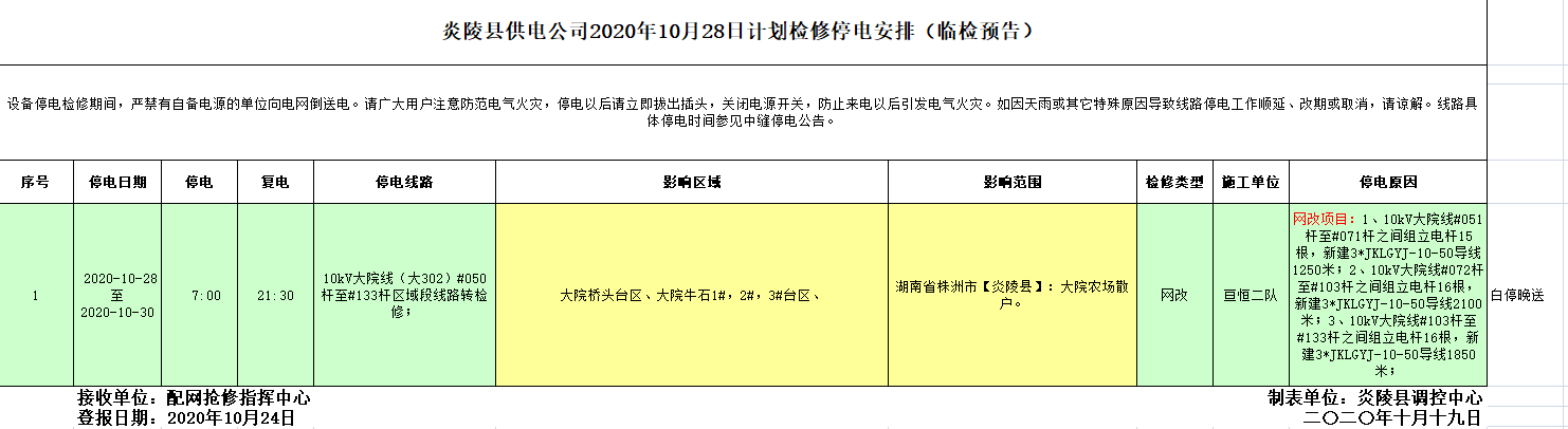 炎陵县供电公司2020年10月28日计划检修停电安排