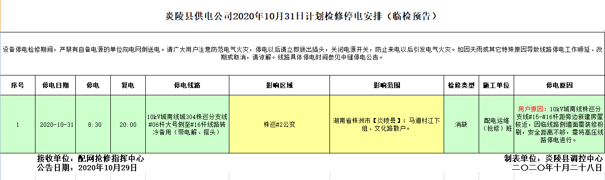 炎陵县供电公司2020年10月31日计划检修停电安排