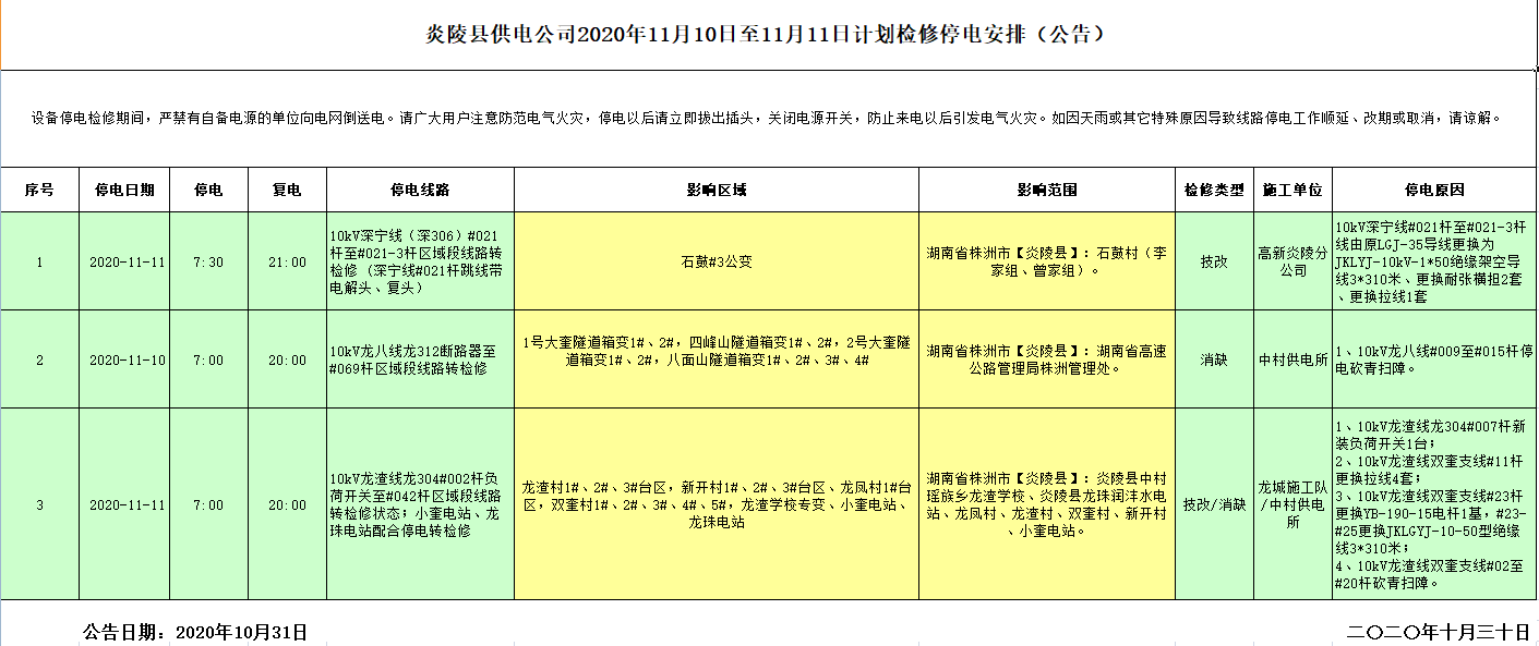炎陵县供电公司2020年11月10日至11月11日计划检修停电安排(公告)