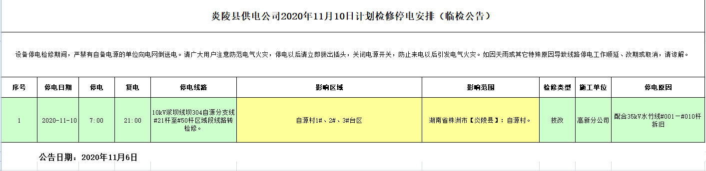 炎陵县供电公司2020年11月10日计划检修停电安排