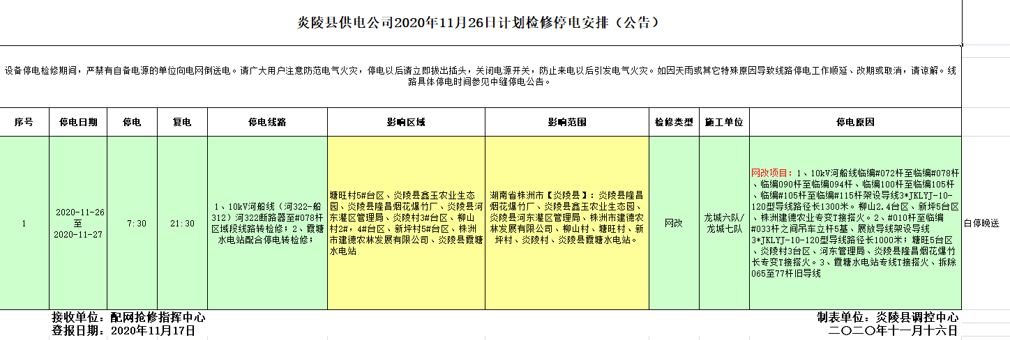 炎陵县供电公司2020年11月26日计划检修停电安排