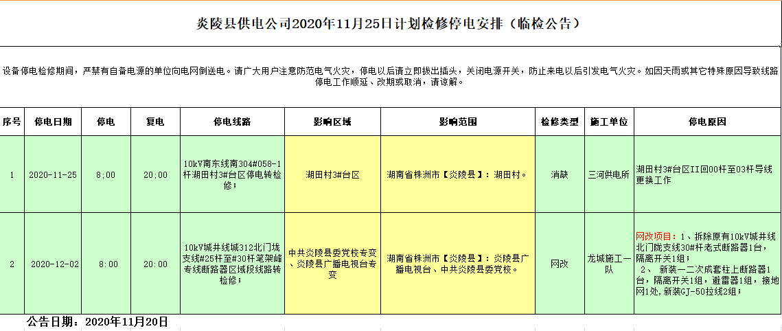 炎陵县供电公司2020年11月25日计划检修停电安排
