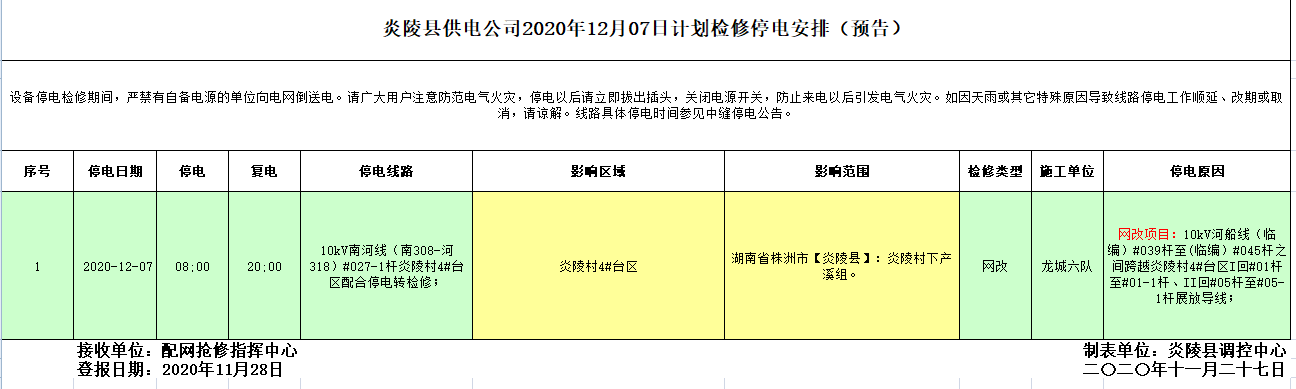 炎陵县供电公司2020年12月07日计划检修停电安排(预告)