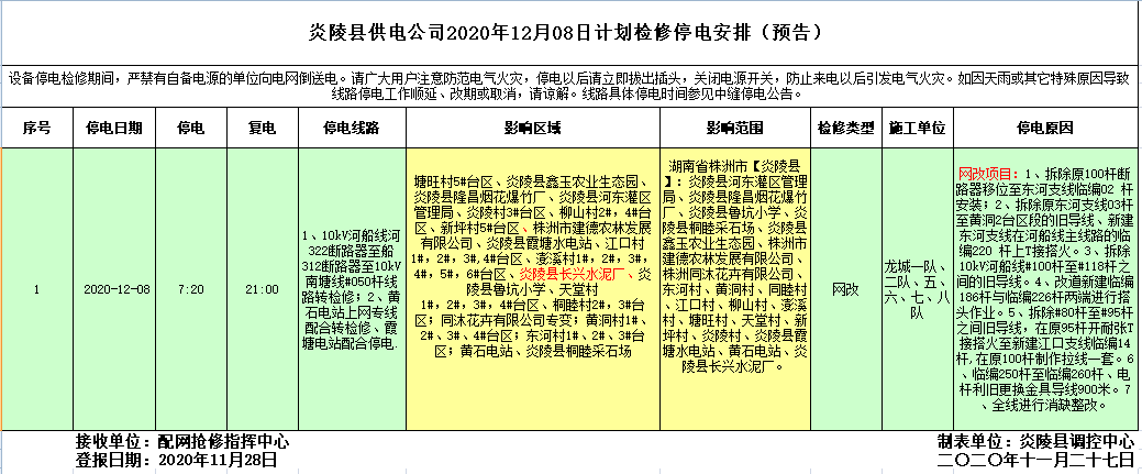 炎陵县供电公司2020年12月08日计划检修停电安排(预告)