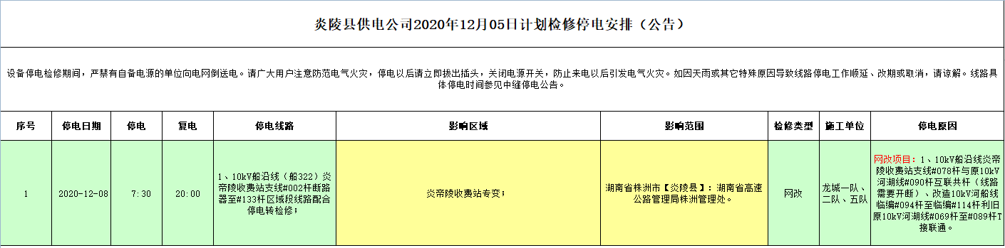 炎陵县供电公司2020年12月05日计划检修停电安排(公告)