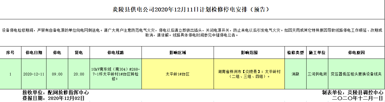 炎陵县供电公司2020年12月11日计划检修停电安排(预告)