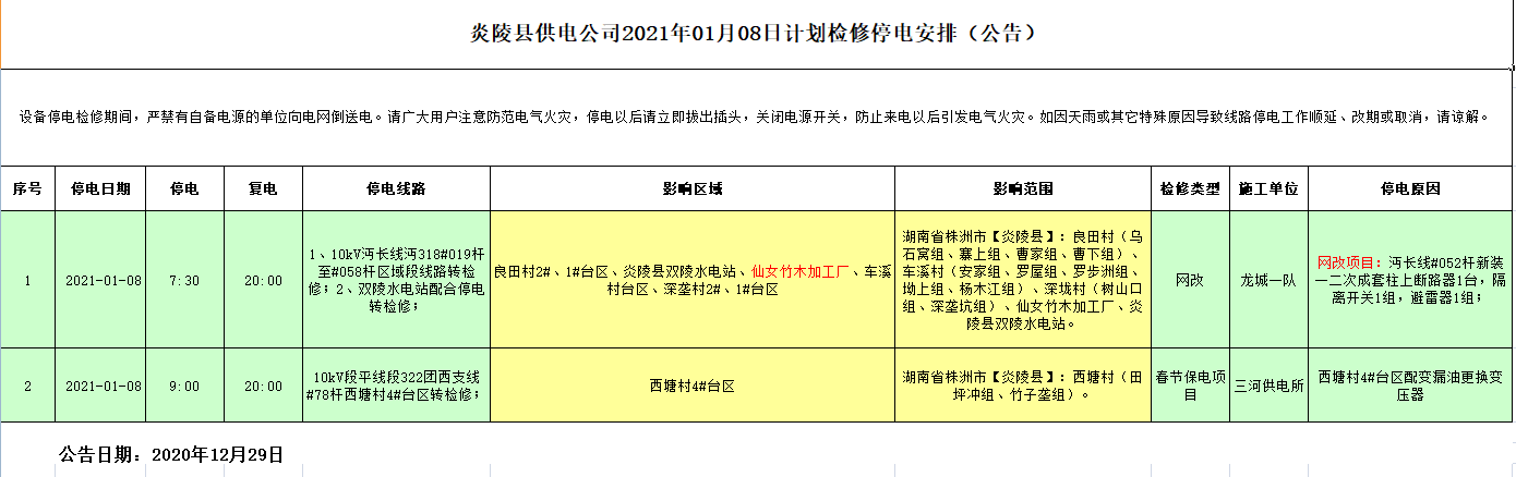 炎陵县供电公司2021年01月08日计划检修停电安排(公告)