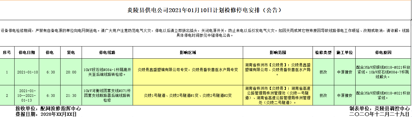 炎陵县供电公司2021年01月10日计划检修停电安排(公告)