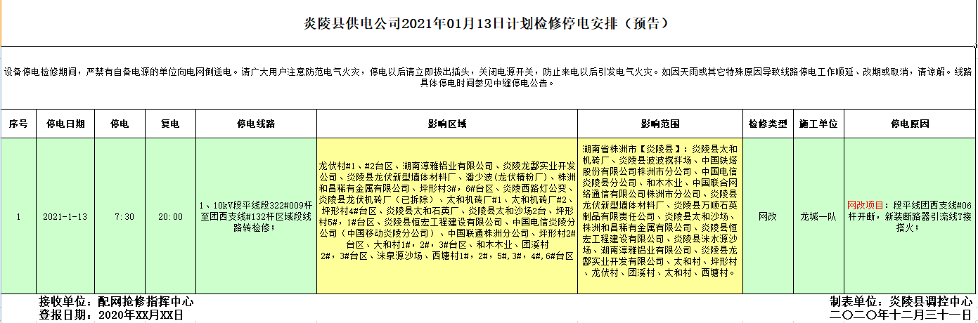 炎陵县供电公司2021年01月13日计划检修停电安排(预告)