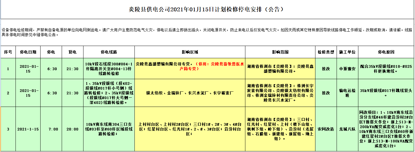 炎陵县供电公司2021年01月15日计划检修停电安排(公告)