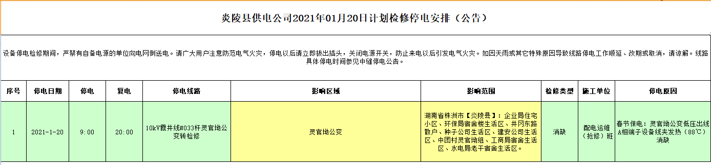 炎陵县供电公司2021年01月20日计划检修停电安排(公告)