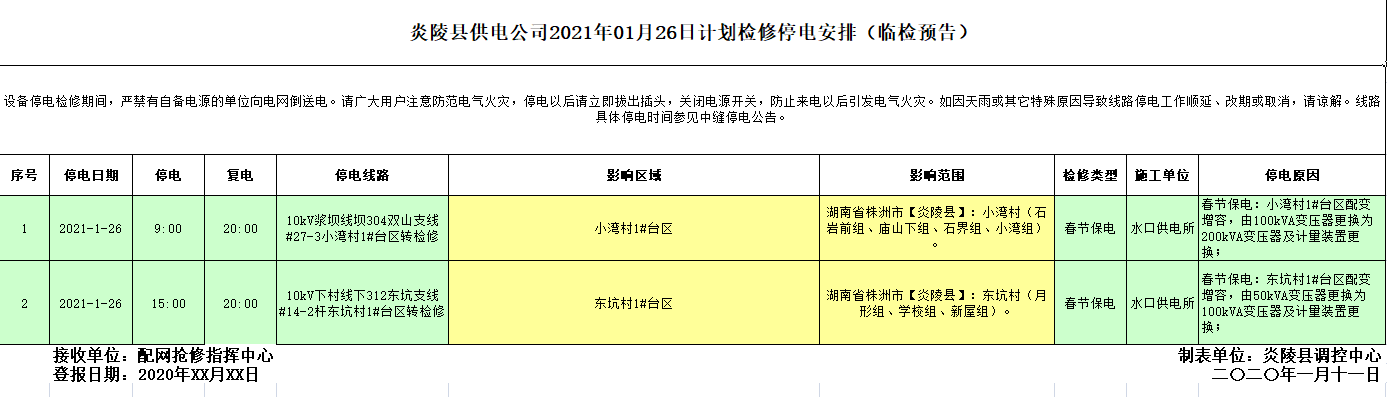 炎陵县供电公司2021年01月26日计划检修停电安排(临检预告)