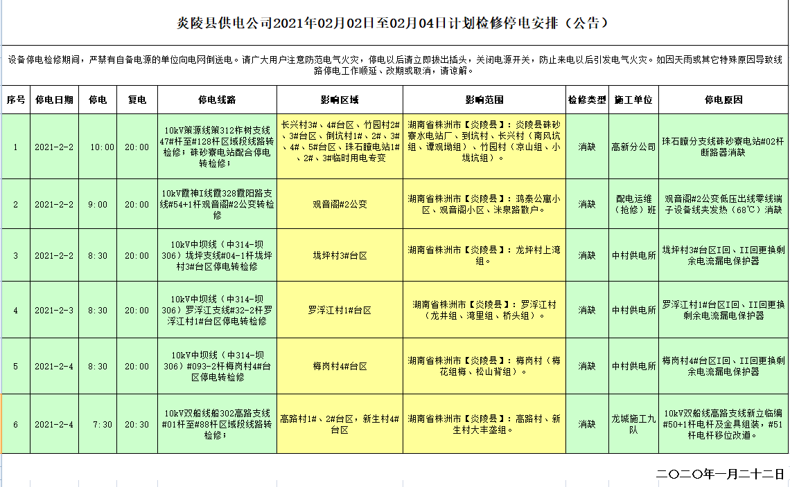 炎陵县供电公司2021年02月02日至02月04日计划检修停电安排(公告)