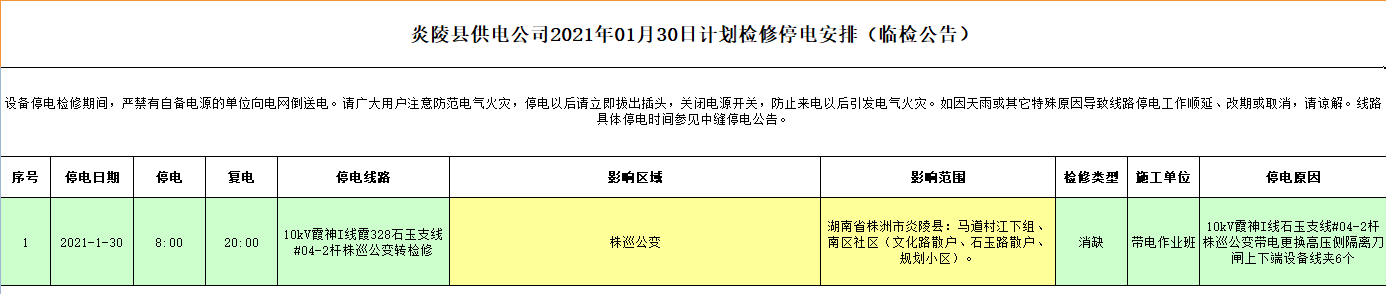 炎陵县供电公司2021年01月30日计划检修停电安排(临检公告)