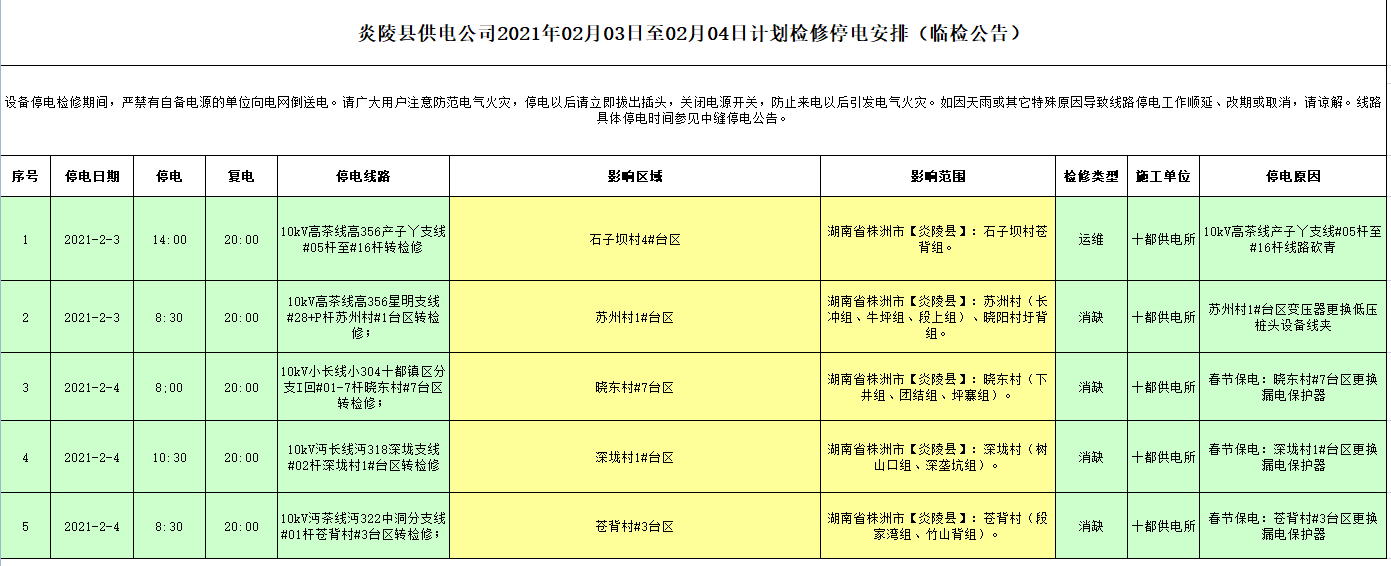 炎陵县供电公司2021年02月03日至02月04日计划检修停电安排(临检公告)