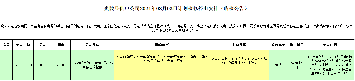 炎陵县供电公司2021年03月03日计划检修停电安排(临检公告)