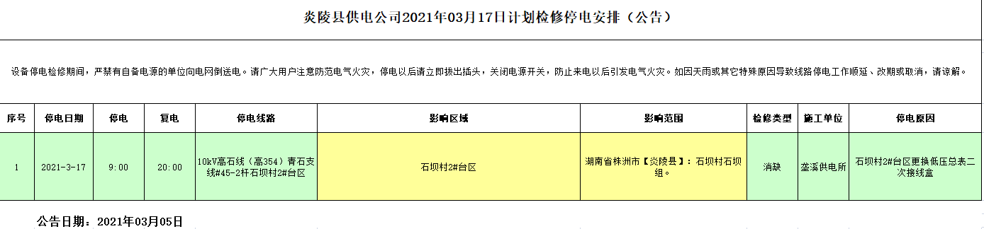炎陵县供电公司2021年03月17日计划检修停电安排(公告)