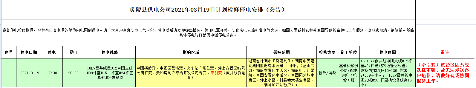 炎陵县供电公司2021年03月19日计划检修停电安排(公告)