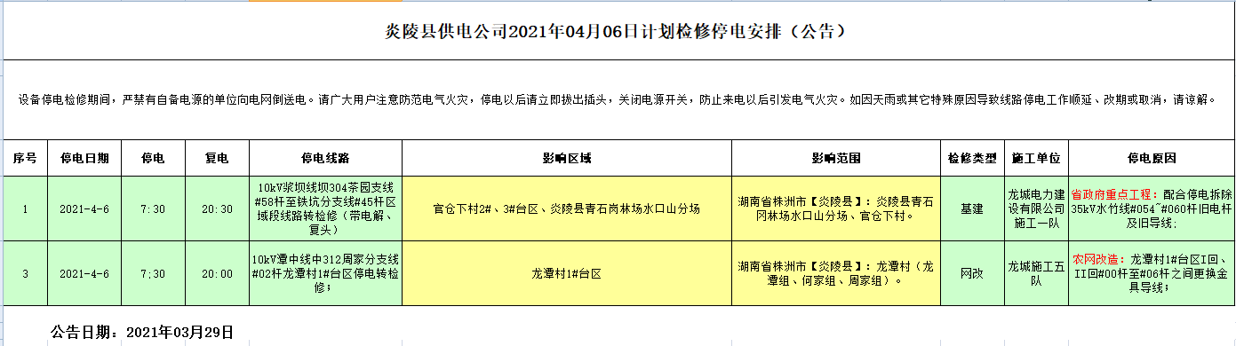 炎陵县供电公司2021年04月06日计划检修停电安排(公告)