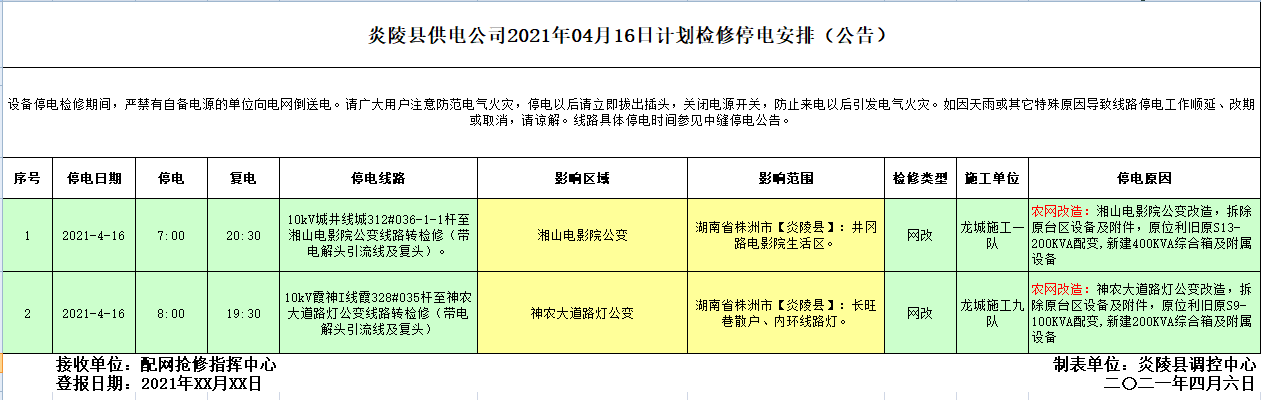 炎陵县供电公司2021年04月16日计划检修停电安排(公告)
