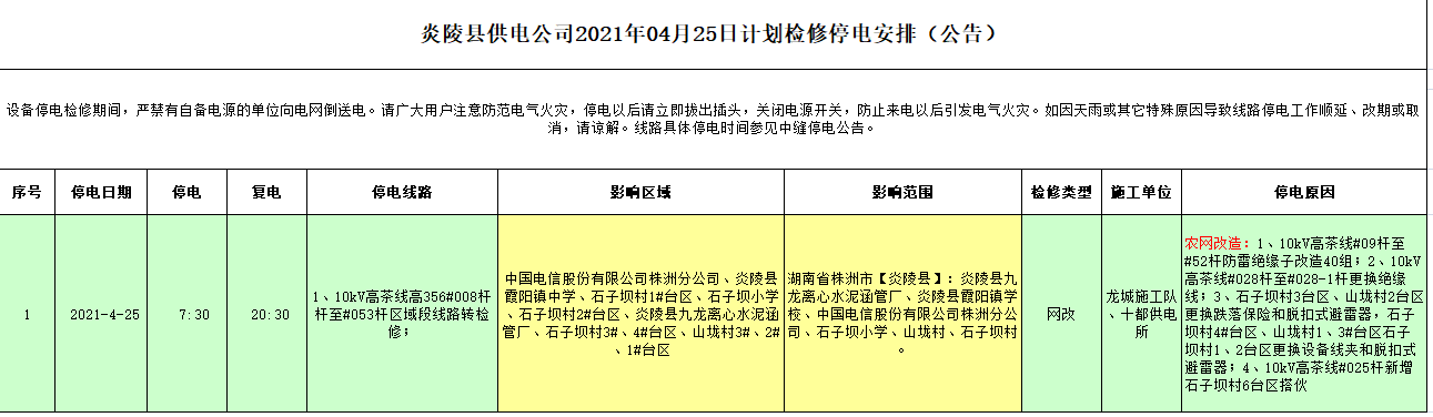 炎陵县供电公司2021年04月25日计划检修停电安排(公告)