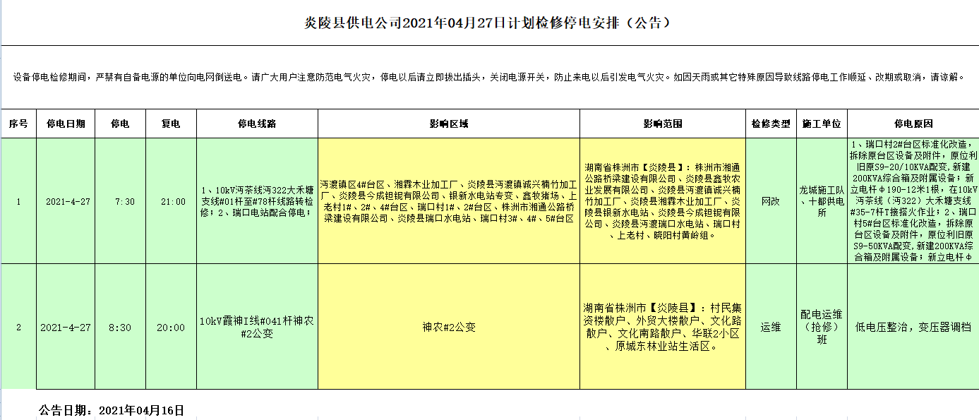 炎陵县供电公司2021年04月27日计划检修停电安排(公告)