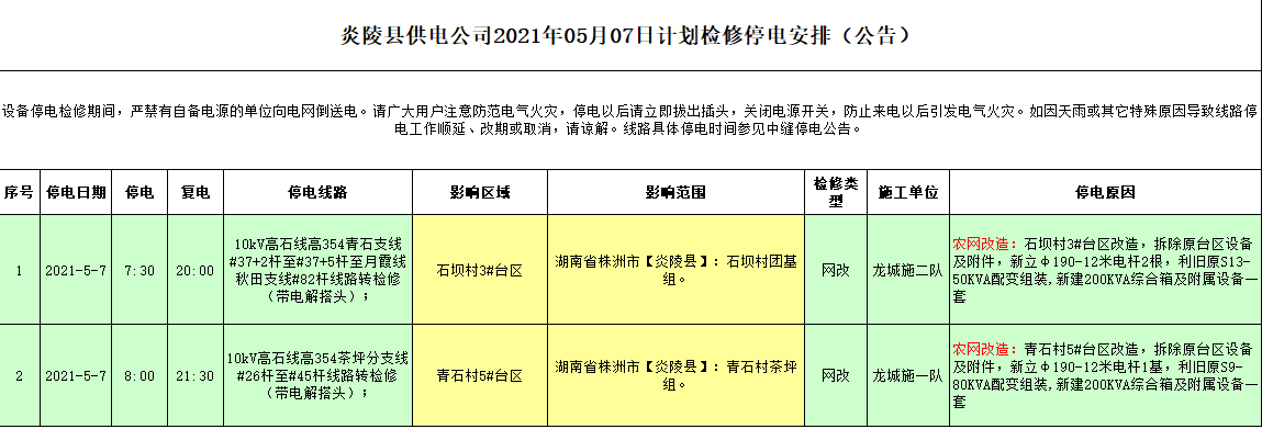 炎陵县供电公司2021年05月07日计划检修停电安排(公告)