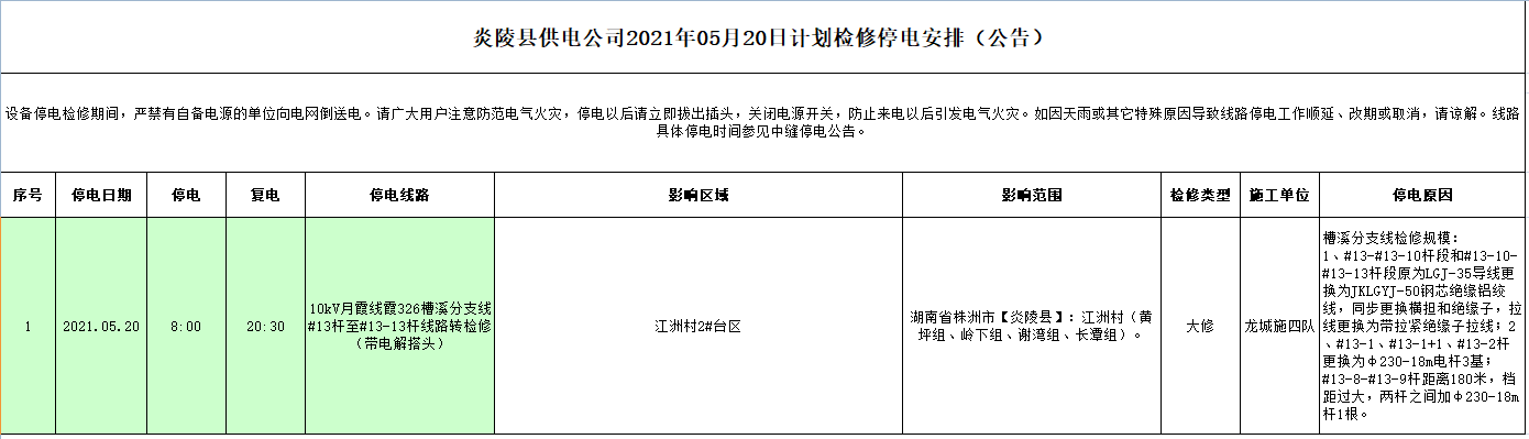 炎陵县供电公司2021年05月20日计划检修停电安排(公告)