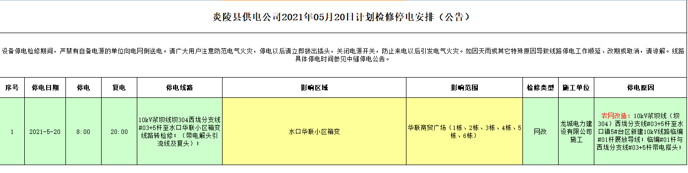 炎陵县供电公司2021年05月20日计划检修停电安排(公告)