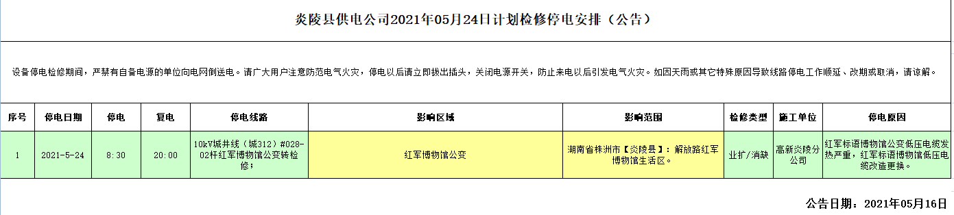 炎陵县供电公司2021年05月24日计划检修停电安排(公告)