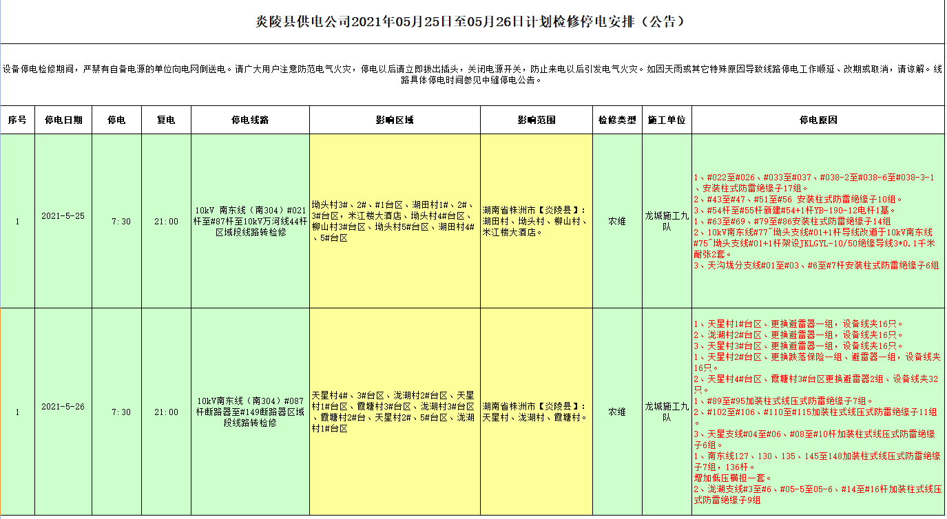 炎陵县供电公司2021年05月25日至05月26日计划检修停电安排(公告)