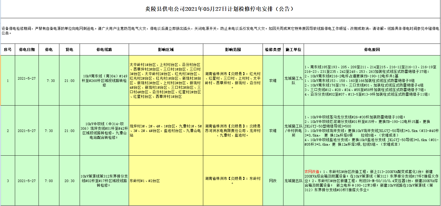 炎陵县供电公司2021年05月27日计划检修停电安排(公告)
