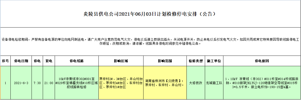 炎陵县供电公司2021年06月03日计划检修停电安排(公告)
