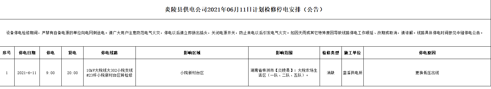 炎陵县供电公司2021年06月11日计划检修停电安排(公告)