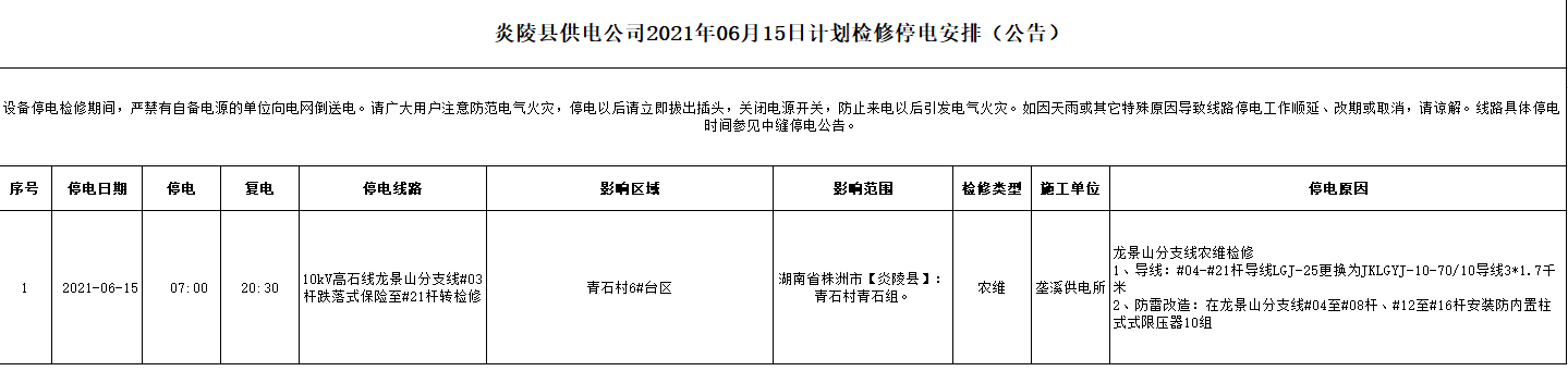 炎陵县供电公司2021年06月15日计划检修停电安排(公告)