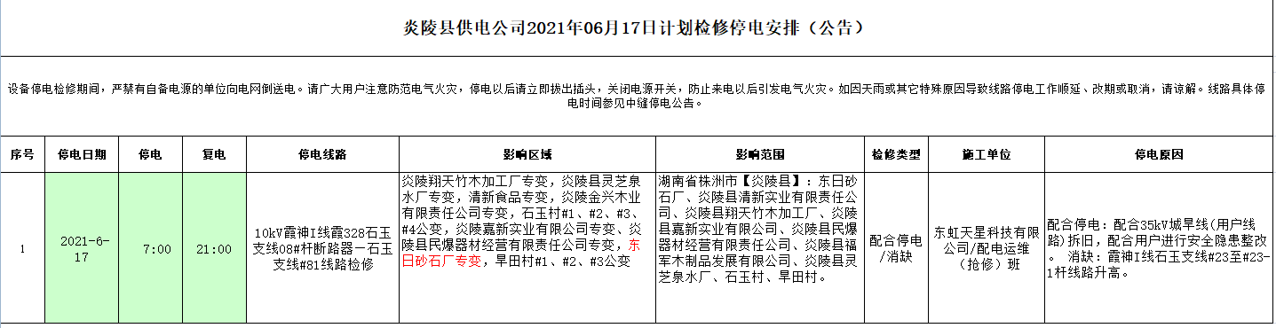 炎陵县供电公司2021年06月17日计划检修停电安排(公告)