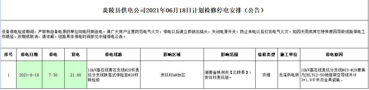 炎陵县供电公司2021年06月18日计划检修停电安排(公告)