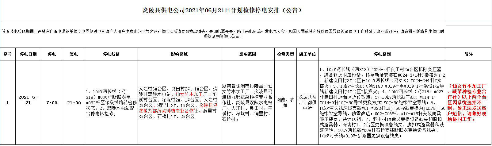炎陵县供电公司2021年06月21日计划检修停电安排(公告)