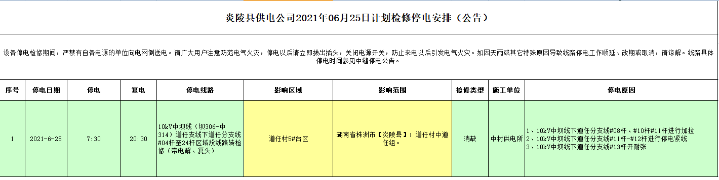 炎陵县供电公司2021年06月25日计划检修停电安排(公告)