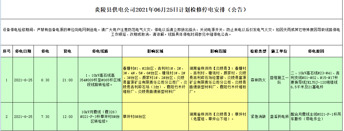 炎陵县供电公司2021年06月25日计划检修停电安排(公告)