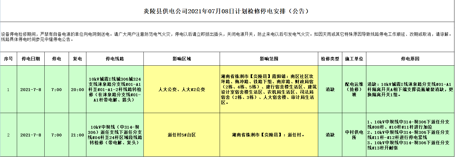 炎陵县供电公司2021年07月08日计划检修停电安排(公告)