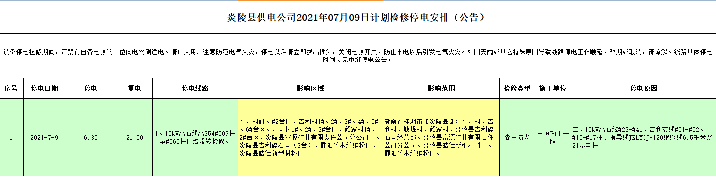 炎陵县供电公司2021年07月09日计划检修停电安排(公告)
