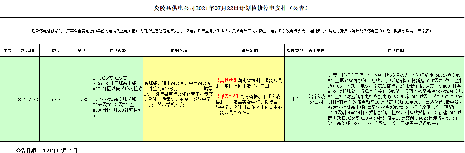 炎陵县供电公司2021年07月22日计划检修停电安排(公告)
