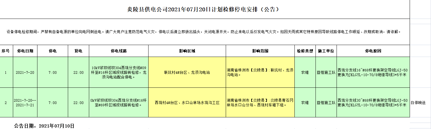 炎陵县供电公司2021年07月20日计划检修停电安排(公告)